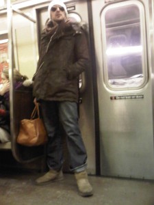 On the F train, swagger on a hundred trillion. He rocked UGGS like nobody’s business. I absolutely adore a man with gender bending styles and the confidence to wear what he wants. Paired with a leather duffle, slouchy beanie, Ray Bans and that ‘and what’ attitude.
