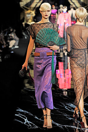 I spotted this ad in the April 2011 edition of UK Vogue and immediately fell in love! I’m obsessed with intricacy and detail so the Lurex Guipure pieces like the monogram fan in this above and seen on the runway below takes me beyond excitement. The campaign is sexy, racy and daring… everything that France and Louis Vuitton should be. xo.