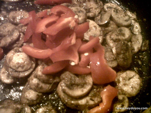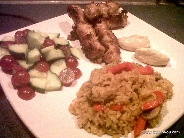 I was super hungry, and all I had was some left over coconut curry rice, half a red pepper, some sliced mushrooms, grapes, half a cucumber, and these soy bites. So I put two and two together, and BAM! Pure deliciousness 🙂