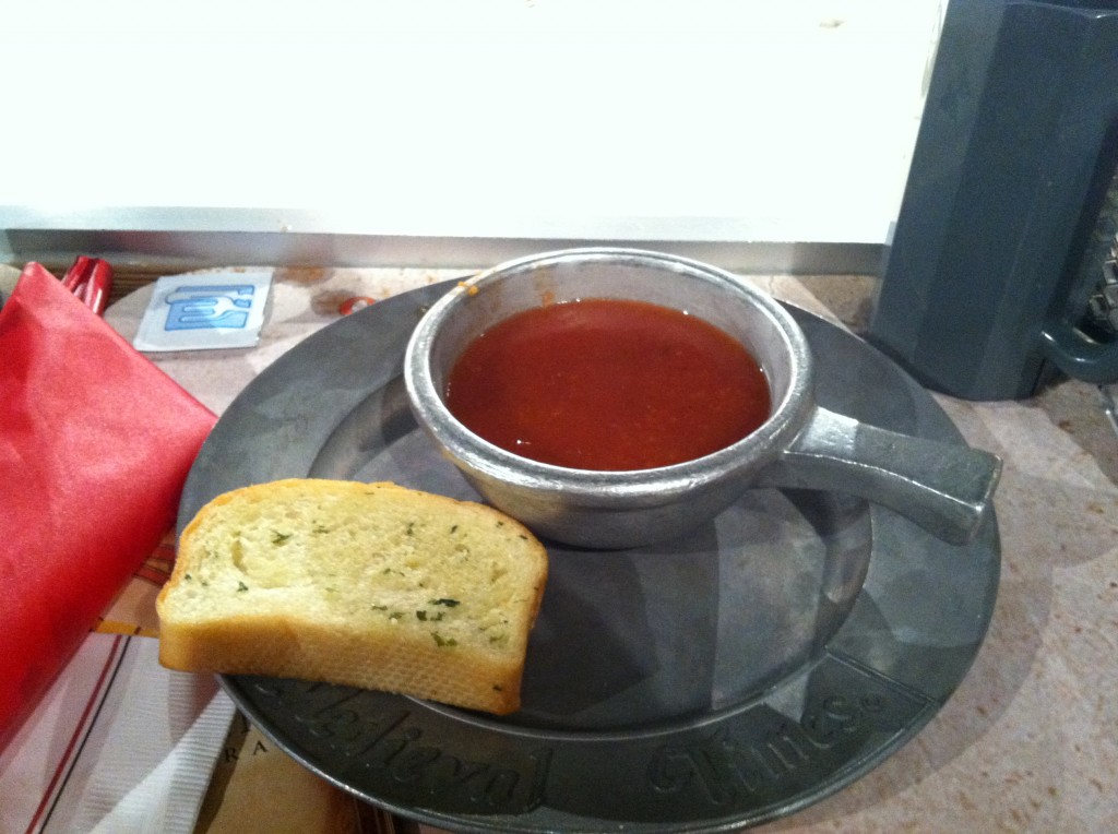 The food was delicious! We had Tomato Soup in a cast iron skillet (made of plastic!) and garlic bread. For the main course, we had fire roasted chicken leg and ribs with potato wedges. YUMMY! The dessert was an apple pie pastry.
