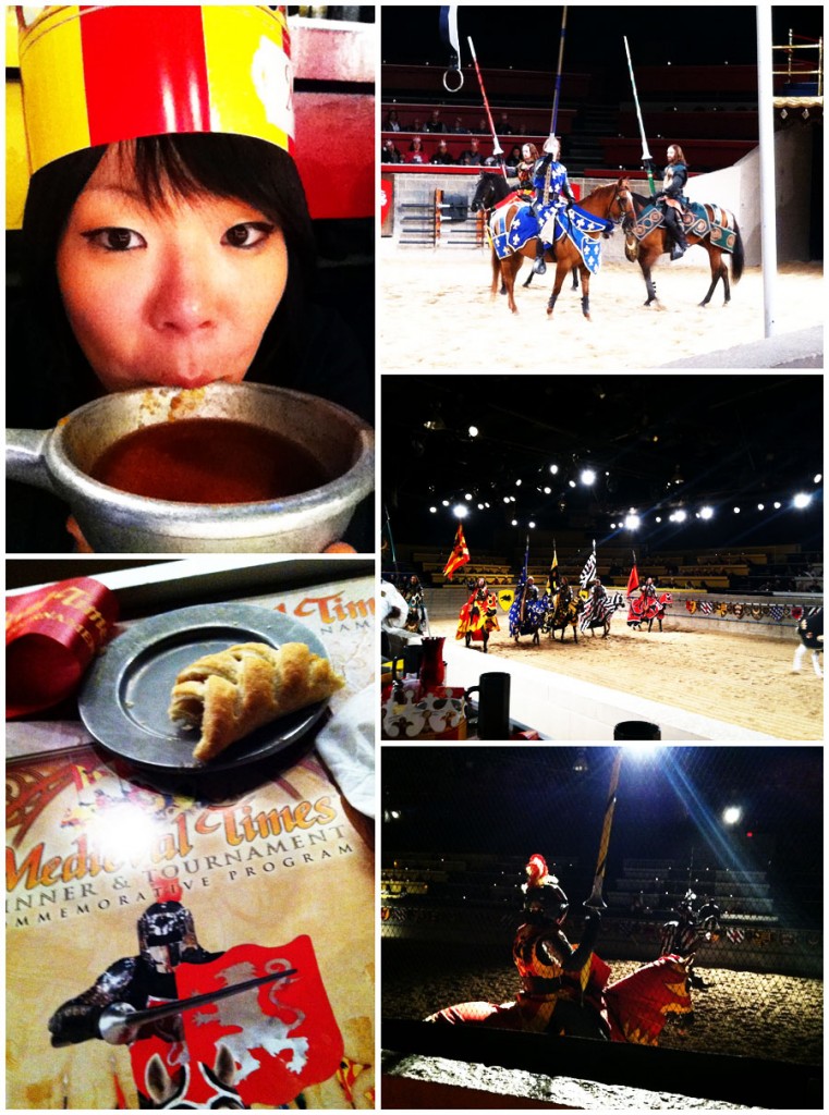Once we arrived at the venue, there were full costumed greeters and they gave us all table numbers with corresponding color paper crowns and flags. We were with the Red and Yellow Knight and part of their table. Then we were seated front and center to see all the action in our color section. Each section has their own color, knight and horse that participate in jousting games and other spectacular performances. When the knight wins a competition, he receives a carnation from the Princess which he will toss to the audience in his section.