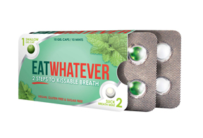 Eat Whatever is a 2 piece breath saver. The first gel cap has peppermint oil and the second one is a mint. This product is so cool because it kills bad breath from the inside out.