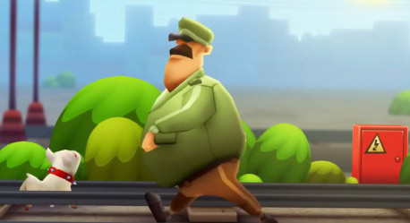 The premise of this game is that Jake is spray painting graffiti onto subway trains and the guard sees him, blows the whistle and starts chasing him with a dog. By the way, the dog looks just like Jacob. I love him.