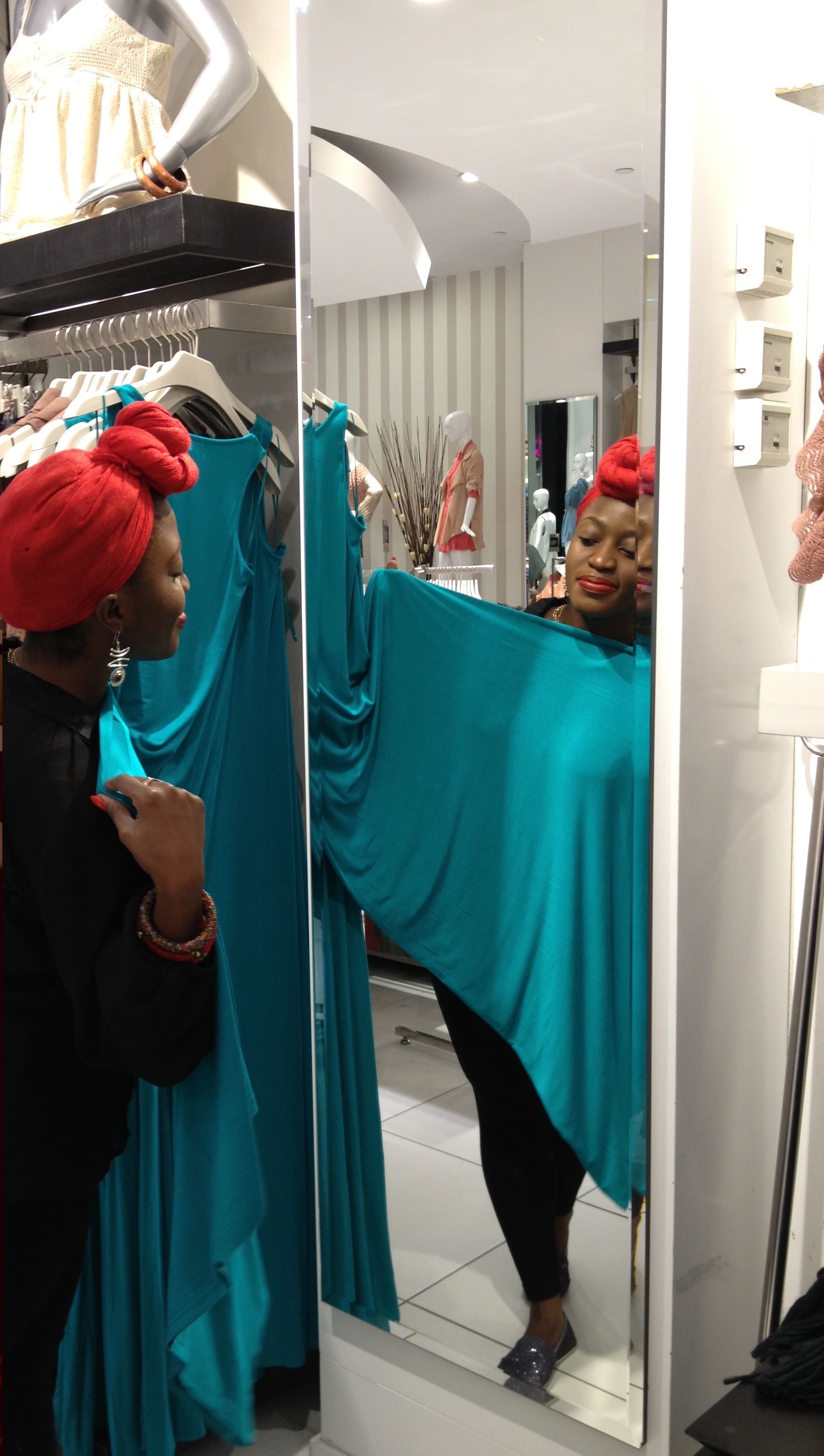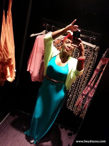 After scanning the aisles (yes all of them), I finally picked a few items and went to try on different looks. After what seemed like an eternity of trying on clothes (totally not complaining, I loved it!) I finally settled on a turquoise maxi dress, a cute neon yellow sweater, and two sets of awesome bangles. The best part about it? I got to take my look home!