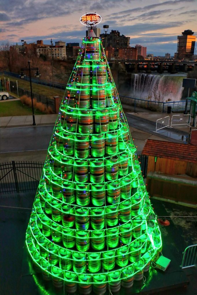 For the third year, the Genesee brewery in Rochester, NY – New York State’s oldest brewery – is preparing to light its massive “keg tree.” The tree will be 26 feet tall and built from 430 empty kegs. The tree will be formally lit during a ceremony at the brewery on Friday, December 2, and will take 2,000-feet of lights to layer the 11 levels of kegs.