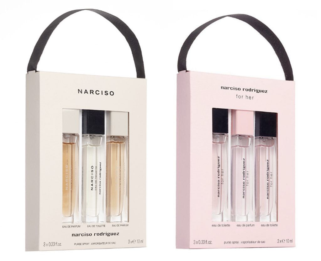 The NARCISO travel spray gift set features a 10 ml Eau de Toilette Purse Spray, and two 10 ml Eau deParfum Purse Sprays.