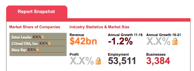 According to IBISWorld Industry Analyst Anya Cohen, “The skincare market is one of the fastest growing product segments in the Cosmetic & Beauty Product Manufacturing industry, with 28.9% of the industry’s total revenue sourced from the product line. A focus on antiaging treatments has boosted this segment’s visibility in the past five years, and consumer concerns about appearance, coupled with advances in technology, have paved the way for this segment’s ascent. At the same time, men’s skin care products have become a significant product category within the industry, as men have increased their spending on facial skin care products in the past five years.”