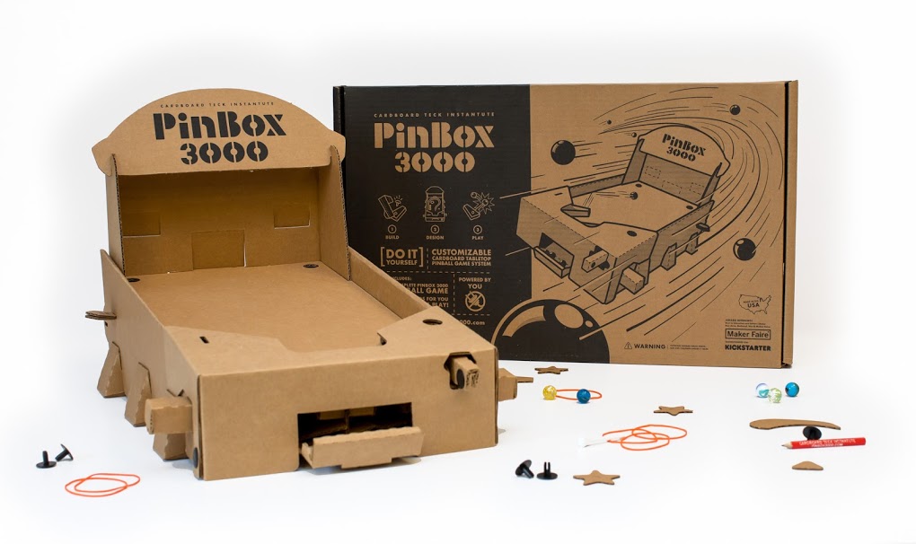 The PinBox 3000 is a build-it-yourself, made in the USA, cardboard tabletop pinball machine kit with interchangeable, customizable, play surfaces. It is not just a product, but a path toward unplugged gaming, crafting and making that the whole family can enjoy.
