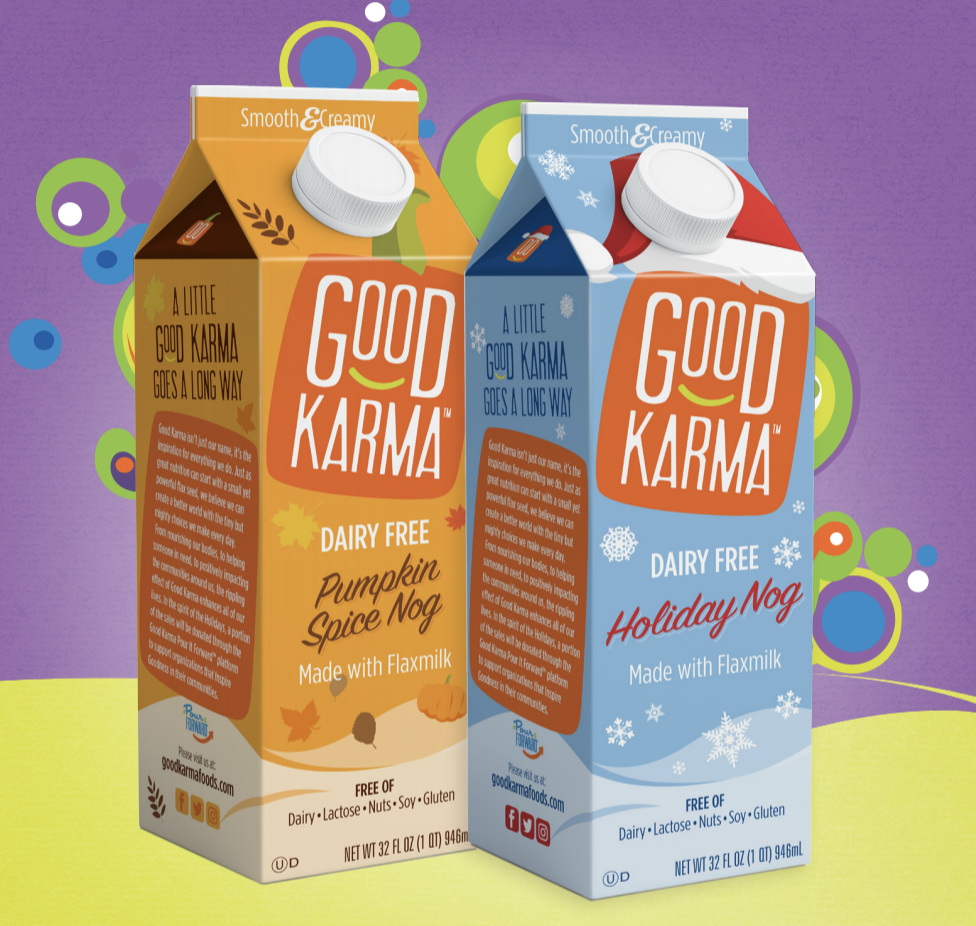 Ring in the holidays with the creamy, delicious taste of Good Karma Pumpkin Spice Nog and Holiday Nog. Made with cold-pressed flaxmilk, these festive options are a rich source of Omega-3 healthy fats and, as always, are free of all major allergens.