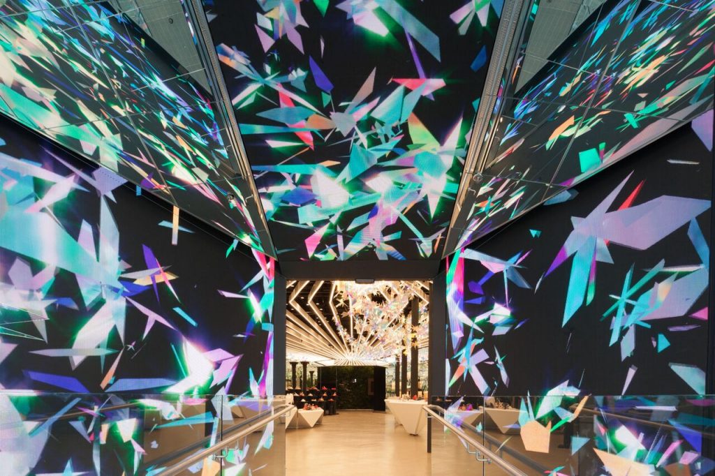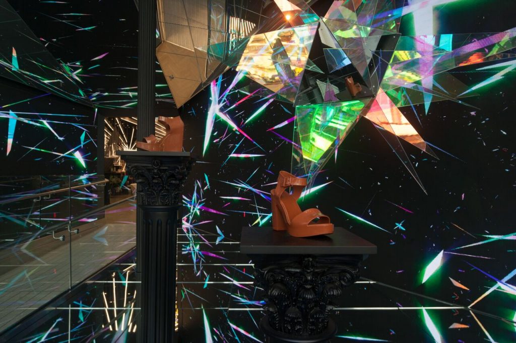 Visitors to Galeria Melissa will find themselves immediately transported through a haze of virtual heat, rising above every surface of Stuyk’s natural universe-inspired setting, accented by glistening shards in ever-changing colors.