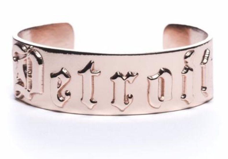 “D Cuff” Detroit — $495.00. As a continuation of their devoted and comprehensive efforts to eradicate illegal gun violence from the streets of their city, the Detroit Police Department and Rock Ventures have collaborated with Caliber Collection the result is Caliber Detroit. Available in Rose Gold Plated or White Gold Plated; one size.