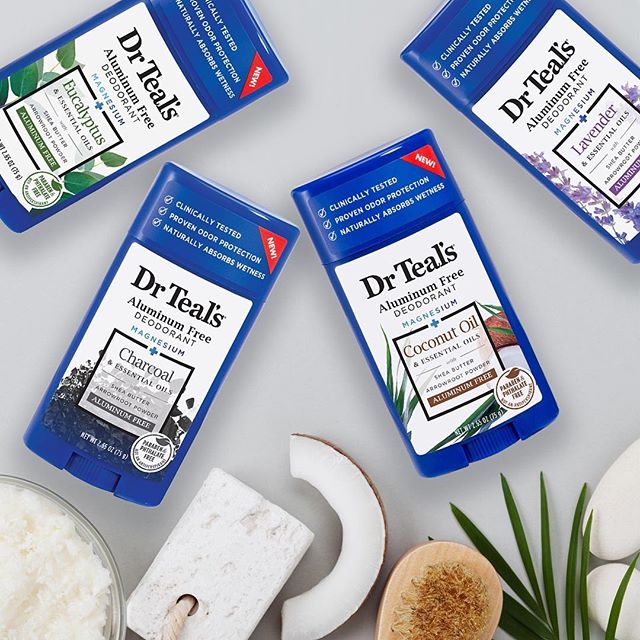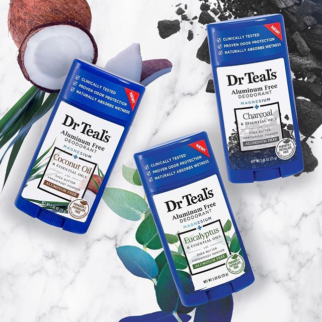 Dr Teal‘s has released a new line of aluminum free deodorants that are clinically proven to protect against odor and absorb wetness all day. Dr Teal‘s Aluminum Free Deodorants are now available nationwide in popular scents including Coconut Oil, Eucalyptus, Lavender and Charcoal.