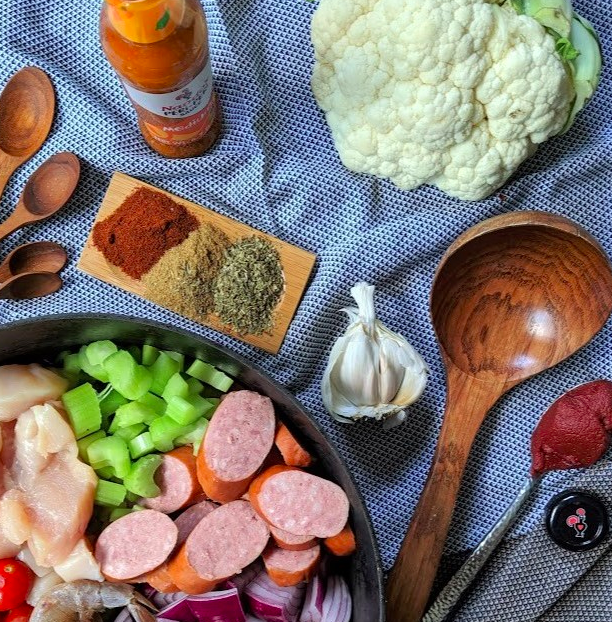 - For the cauliflower rice: Remove the leaves and trim the core of half a cauliflower. Break into floret and then pulse in a food processor until it resembles rice. Put into a cheesecloth of clean tea towel and squeeze out as much liquid as possible. Spread out on the tea towel to dry out even more while you cook your Jambalaya.