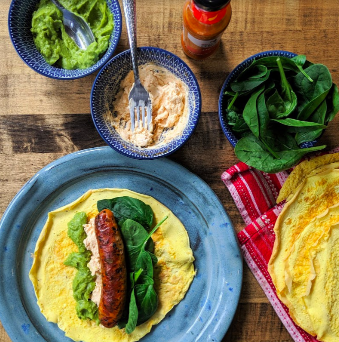 These Keto wraps are made with eggs instead of flour, and are even easier to make than pancakes! They also taste better because they have that Peri-Peri zing to them! Use the flavor you love the best to add your spin to this recipe, but please note – the Medium and Hot flavors are our most keto – friendly. With very low carbs, and packed with protein, healthy fats and leafy greens, this recipe is a Keto power package. Make for brunch on the weekend for friends; make one at a time each day; or make a batch of wraps and sausages for the week, then warm and assemble every morning for breakfast on-the-go. To make this recipe even easier, you can substitute the whole eggs for liquid eggs, and the avocado for ready-made guacamole.