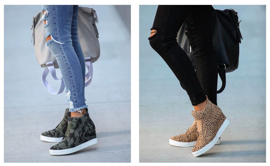 Extra mile wedge sneaker – Go the extra mile with a hidden wedge sole, elastic band and inner side zipper closure that makes this sneaker subtly supportive while providing chic and edgy style in camo and cheetah prints.