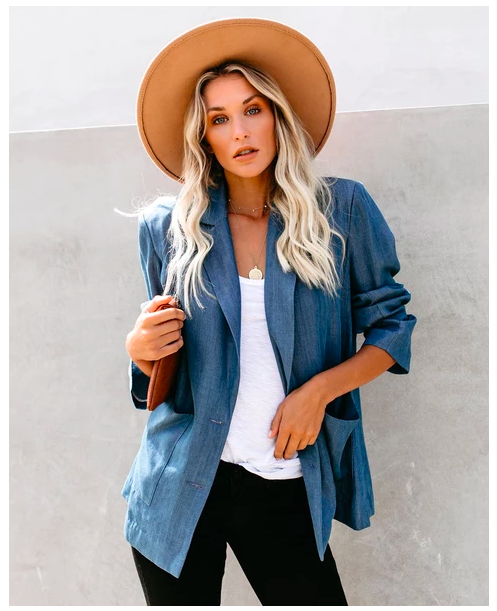 Travel Light Pocketed Chambray Blazer – This denim chambray tone blazer is an office layering essential that features a notched lapel and long sleeves. The relaxed boyfriend silhouette and lightweight tencel fabrication makes this an ideal blazer to transition from summer to pre-fall.