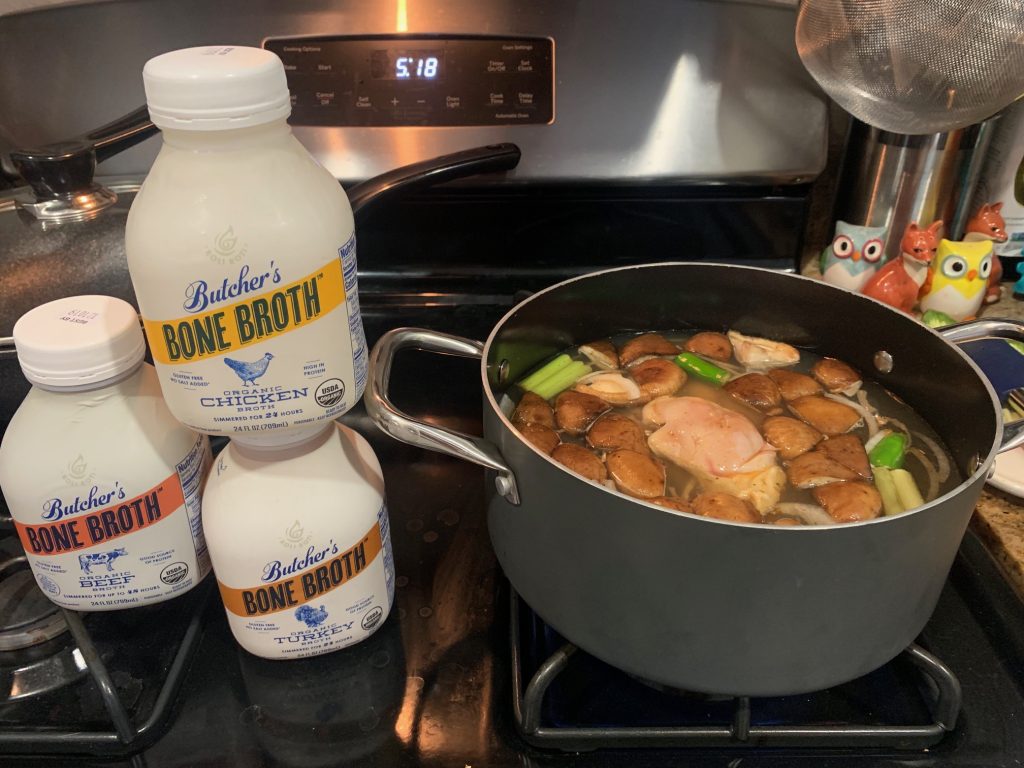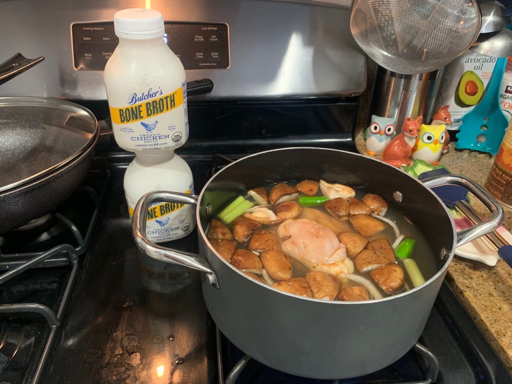 - Heat on low-medium covered until celery is soft; add 2 Tbsp of the Butcher’s Chicken Bone Broth to keep celery from sticking to pan.