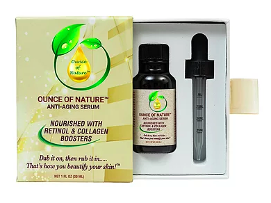 Cleanse face with a mild facial soap/cleanser and pat dry. Using the measured dropper(included), add 1/4 dropper – 1 full dropper of Ounce of Nature™ Anti-Aging Serum into the palm of your hand, careful to avoid spilling. Using your fingertips, dab a light coating of serum on any noticeable fine lines and wrinkles.