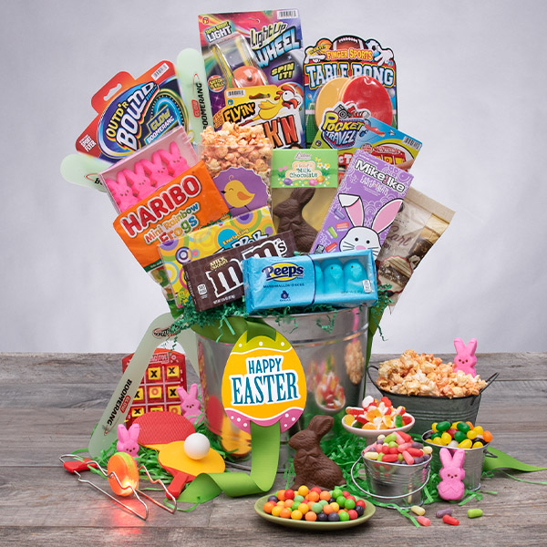 No Easter morning is complete without great toys and delicious sweets. Inside a shiny metal bucket, your recipient will find festive treats, including a solid milk chocolate bunny and classic Easter candy, along with an array of fun games that will easily make this Easter morning completely unforgettable!