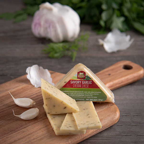 - Savory Garlic Cheddar Cheese by Mountain View Cheese Co. – 2 oz. – Zesty garlic blended with mild cheddar cheese, the perfect complement to your favorite cracker!