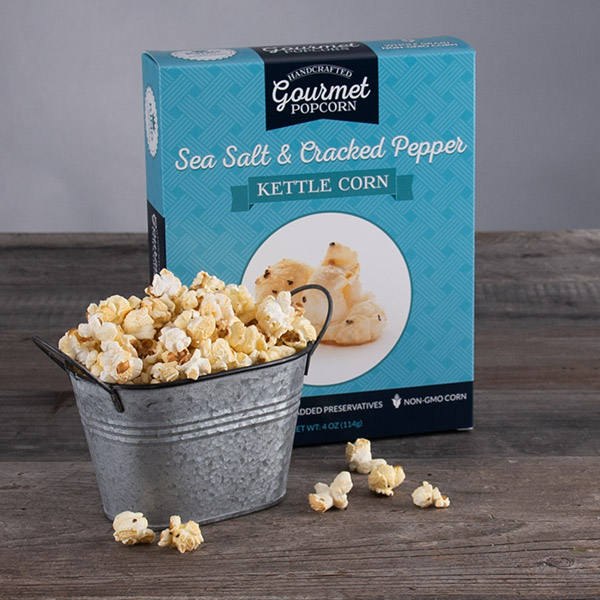 - Sea Salt & Cracked Pepper Kettle Corn by GourmetGiftBaskets.com – 4.2 oz. – Gourmet popcorn that’s sprinkled with sugar, drizzled with oil, and rolled in freshly cracked pepper and sea salt.