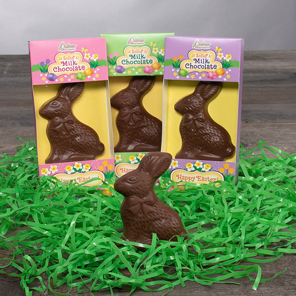 - Solid Milk Chocolate Bunny by Palmer – 2.25 oz. – A decadent Easter treat made of solid milk chocolate that sweeten up Easter morning.