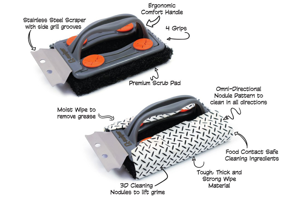 The patented Q-SWIPER Grill Brush and Scraper uses food-safe tough cleaning wipes to absorb grease from cooking surfaces while its powerful omni-directional 3D cleaning nodules help swipe away tough grill grime. Plus no more using the same contaminated cleaning tool to clean your grill grates because with the Q-SWIPER® you use a new wipe every time for a cleaner, healthier grill. Another great aspect of the Q-SWIPER® Cleaning Wipes is by removing grease, you are cutting down on dangerous flare-ups!