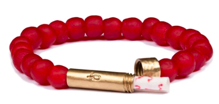This collection features African recycled glass beads handmade by members of the Krobo Tribe in Ghana, Africa. Using centuries-old techniques, they form each bead by compressing the glass into a dry grain, heating the grain, and pouring into porcelain molds, before adding the stem of the cassava leaf to form the hole. The final heating burns the stem away and fuses the glass together. Vibrant colors and irregular shapes of each bead create one-of-a-kind pieces.