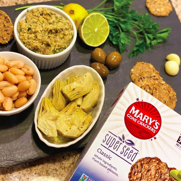 Enjoy this simple, pantry-friendly recipe for White Bean & Artichoke Tapenade Dip! A delicious and healthy snack, easily paired with any of Mary’s crackers!