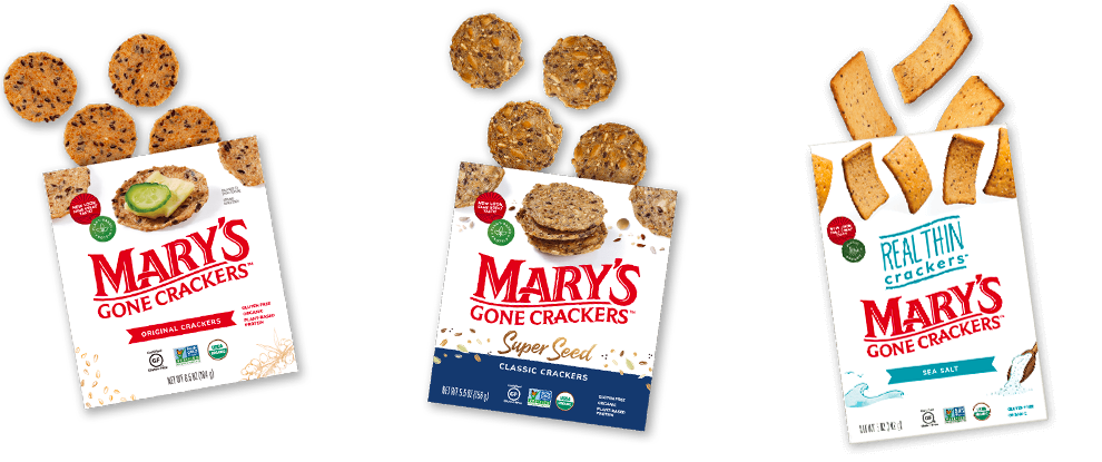 The Mary’s Gone Crackers® seed was planted the day Mary discovered the power to create amazingly good snacks using only whole, plant-based ingredients. The popularity of her tasty crackers quickly spread far beyond her kitchen, inspiring her to walk away from a successful career to follow her passion. Today, the brand continues to build on Mary’s original creations with new and exciting flavors baked with ingredients you can actually see—making each cracker a unique window into the love of seed-craft. Eat them right out of the box or get creative with your favorite toppings to build your own taste bud adventure!