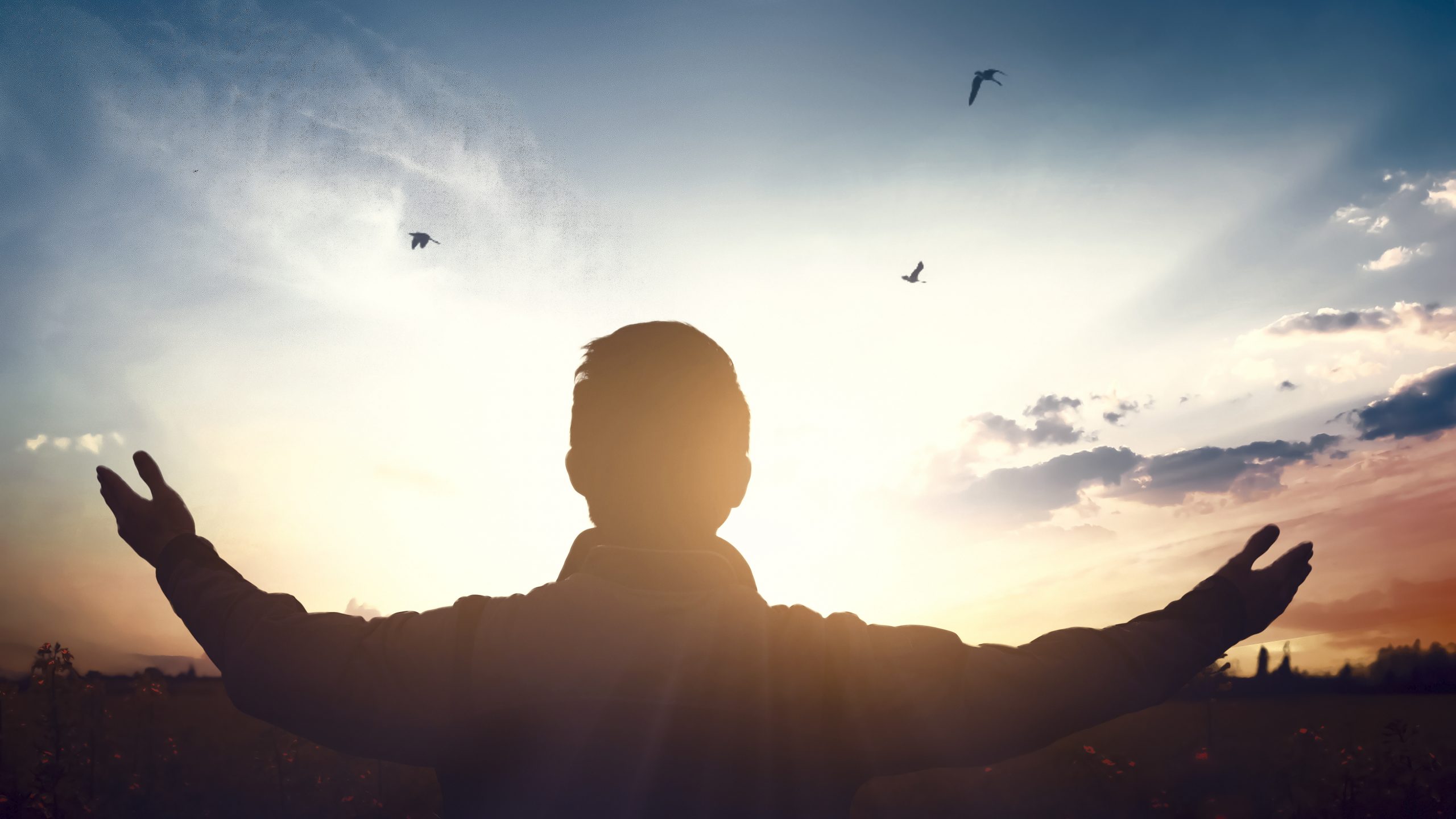 International Day of Peace concept: Silhouette of man raised hands at sunset background March 19, 2021 /