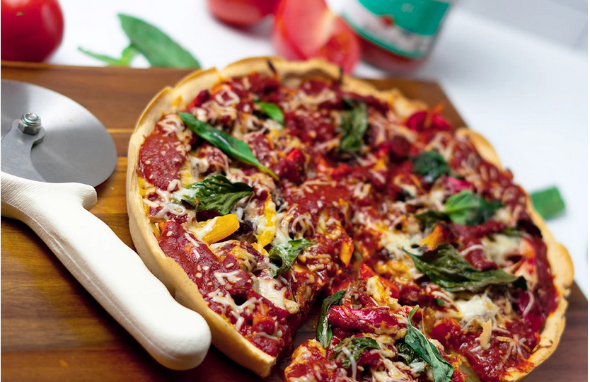 The culinary equivalent of a momma bear hug, Chicago-style deep dish pizza nests its toppings in a sturdy bowl of crust whose walls wrap protectively around the oozing, oven-sizzled ingredients that are blanketed by a chunky layer of red pizza sauce. Its comfort is thick, deep, and layered. Unlike the shoulder-tap-for-two-seconds hug delivered by a thin-crust pizza, the deep dish pizza grabs your attention on first sight with its sheer size and heft before nuzzling you in a warm embrace as you bite into its layers, fork and knife required.
