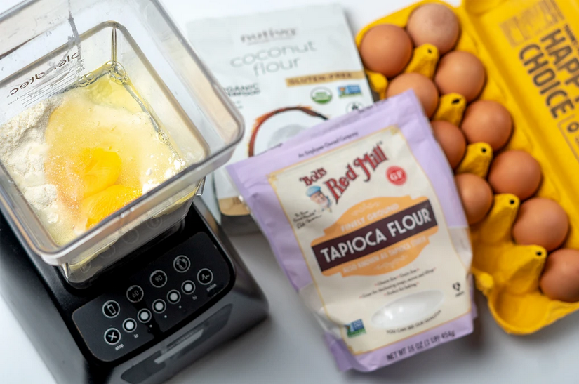 - Place the flours, eggs, salt, dried herbs, and 3 Tbsp. of avocado oil into a blender or food processor. Pour in 1 cup of hot water. Process until smooth. Let the mixture sit in the blender for 10 minutes.