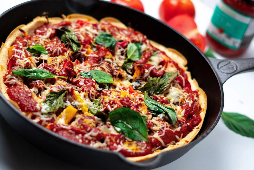 Perfect cool-temperature food, let me introduce Primal kitchen’s deep dish pizza recipe includes a grain-free crust, keto-friendly toppings, and unsweetened red pizza sauce baked in a cast iron skillet. This deep dish pizza recipe takes about an hour to prep and bake so you can have a homemade Friday night pizza and movie night ready in a reasonable amount of time.