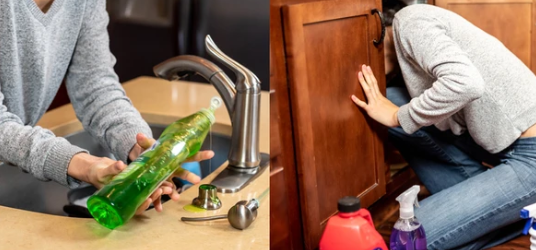You push down on the soap dispenser and…nothing – as usual. I know, it’s so frustrating! Refilling it from the top means a messy overflow of soap all over your counter. Refilling the reservoir from under the sink means clearing out all the cleaning bottles and crawling into the cabinet to unscrew the bottle…What a pain!