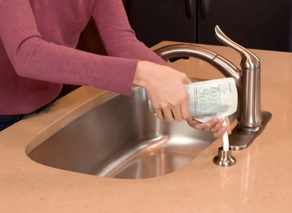 Top Soap is the world’s only easy refill system for your countertop mounted soap dispensers. Simply remove the pump, insert the spout and squeeze in the top-quality dish soap or moisturizing hand soap. The easy pour spout fits deep inside to avoid spills, and the easy refill pouch is sized just right so you won’t overflow on to your counter. Now you can quickly and easily refill without the mess!