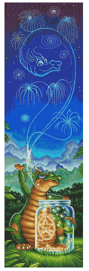 After carefully collecting a jarful of fireflies, this darling dragling joyfully releases a sparkling celebration into the night. Exploding like fireworks against a sapphire sky, fortune and prosperity glitter across the heavens.