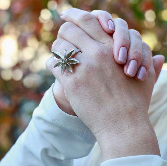 Nature is beautiful. Nature is alive. The star-shaped pods of the star anise plant are strikingly beautiful, as exotic in their shape as they are in their flavor. Recreated in sterling silver or gold, they shine brilliantly like a star.