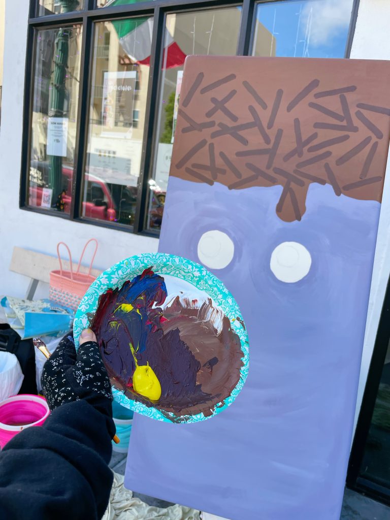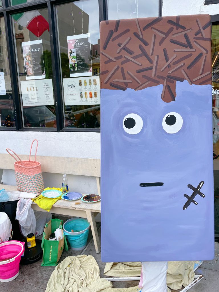 Lulu had so much fun painted this big paleta. She used outdoor mural paint and mixed the color to be a purple taro color. And of course a nice creamy brown color for the milk chocolate dip. She added chocolate sprinkles by painting three different shades of brown colors on the top of the milk chocolate dip. The last, she painted the eyes, month and stitches on, to make the paleta spooky and cute.