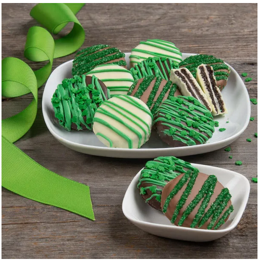 No need to search for the pot of gold at the end of the rainbow – these Belgian chocolate covered Oreo® cookies make the perfect St. Patrick’s Day gift! Send your Happy St. Paddy’s Day wishes with these shamrock adorned, green tinted white chocolate drizzled delights.