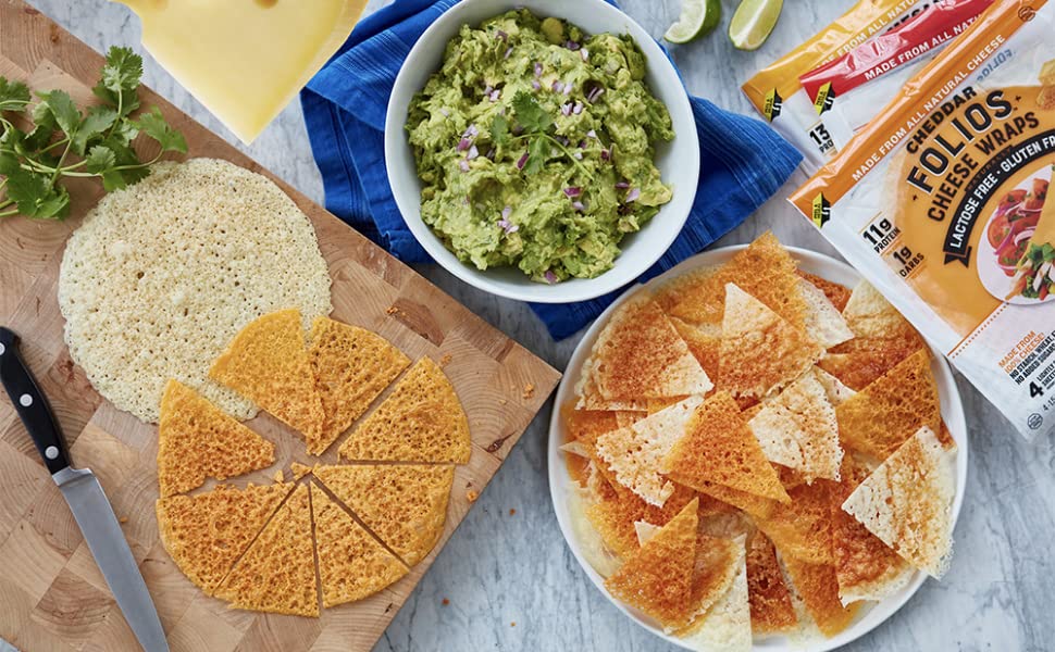 Folios Cheese Wraps are the original 100% cheese wraps, with no gluten or grain, lots of protein and calcium, and only 1g of carbs, which come in Cheddar, Parmesan, Jarlsberg, and new Mozzarella. Despite the name, they can be used in so many ways besides as a tortilla alternative. You can shape and bake them for cheesy taco shells or bowls, crisp them up for chips or a pizza crust, swap out your lasagna noodles, and much more.