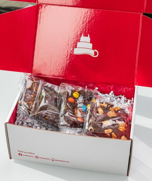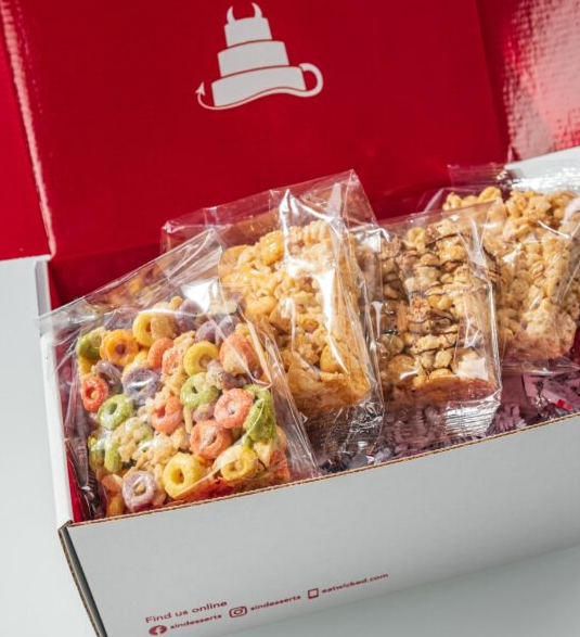 Serves up custom and semi-custom cakes and sinful desserts, Sin’s Assorted Brownie and Krispy Packs are filled with dark Dutch chocolate brownies and marshmallow krispies. Flavors include the standards, but also: Mint, Mexican, Candy Explosion, Caramel Almond Coconut and Sugared Peanut. A menu of crispy flavors was also developed to reignite childhood memories of Cocoa Krispies, Cap’n Krunch, Honey Smacks, Froot Loops, and Reese’s Puffs.