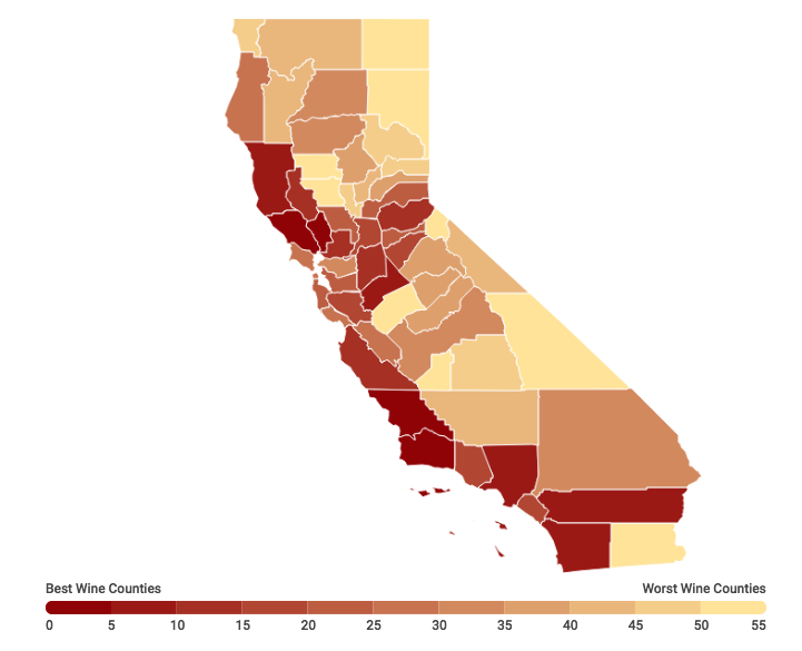 “Dry” Counties: The counties at the bottom of our ranking should come as no surprise — viticulture isn’t big here. Kings County finished last overall, bested by Merced, Colusa, Modoc, and Alpine counties (in that order).