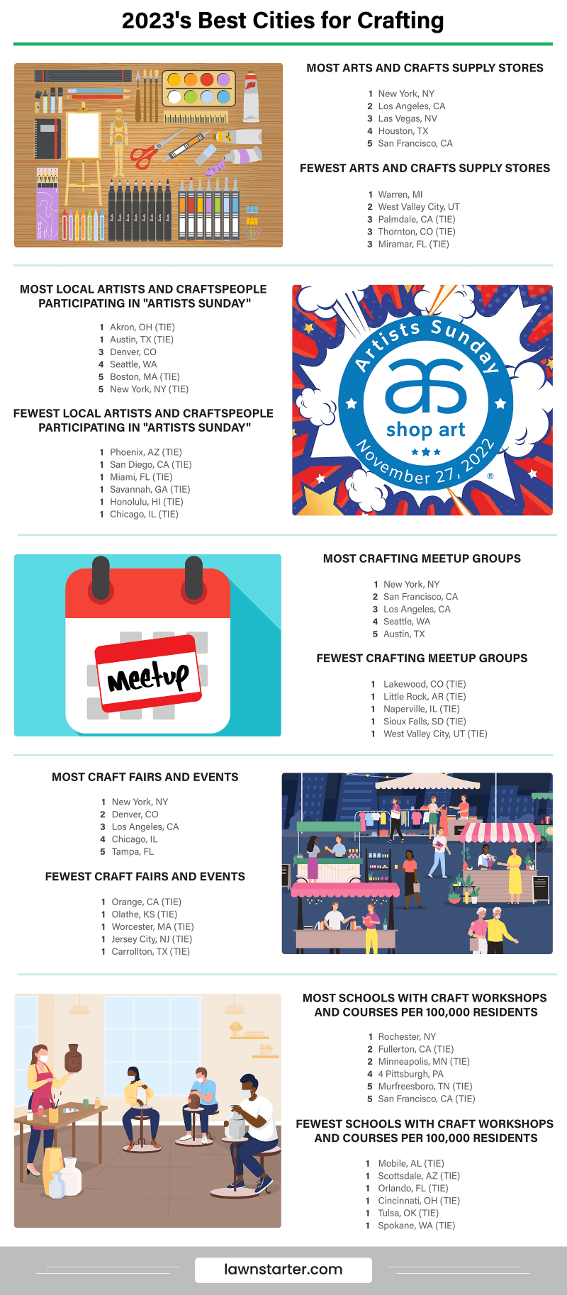 LawnStarter looked for easy access to crafting supplies, a big crafting community, workshops for learning new techniques, and plenty of crafting events to attend.