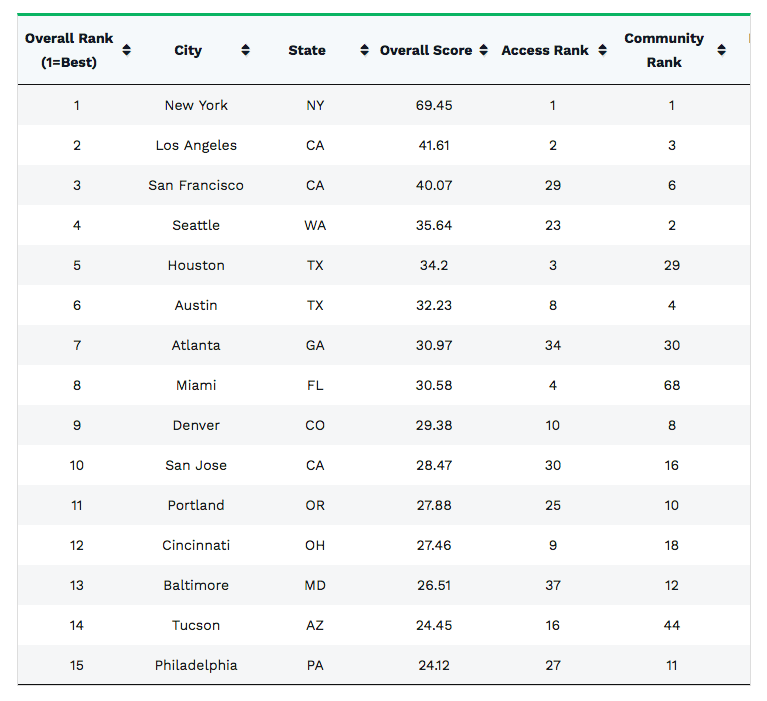 In general, the biggest U.S. cities like New York, Los Angeles, and Houston fared best in LawnStarter ranking. More residents simply means more demand for creative outlets. That’s why these cities collectively showed well in Access, Community, and Events.
