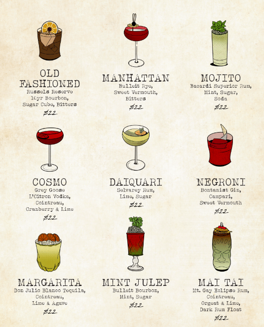 - Puss & Boots: a paw print marks this creation, which is made with Patron tequila, St. Germain and lemon, charcoal smoked and served in a chilled glass.