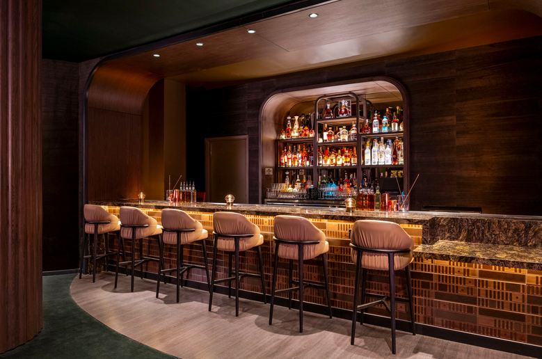 Easy’s is a sultry world accessible to those in the know, where emerald hues and velvet textures enthrall the senses. Theatrical floor-to-ceiling emerald green drapery and velvet upholstered panels frame the recessed performance stage and an explosion of florals on the ceiling is mirrored on the carpet below. Luxurious sofas featuring sophisticated channel tufting are paired with comfortable chairs, while dark-stained oak wood and marble coffee tables provide an open invitation for lounging.