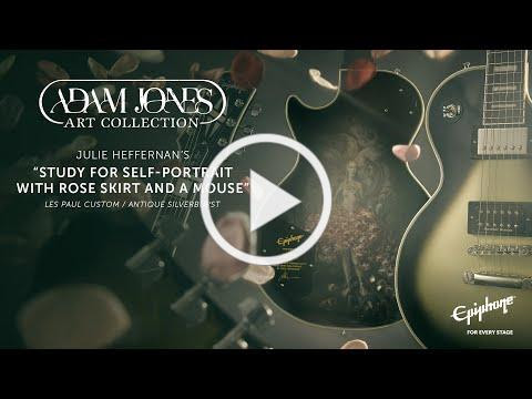 This Adam Jones Les Paul Custom Art Collection guitar features Julie Heffernan’s “Study For Self-Portrait with Rose Skirt and a Mouse” on the back, and it is also an exceptional instrument for your next musical masterpiece. It has a bound mahogany body with a maple cap, a three-piece bound maple neck with an Adam Jones Custom profile, and an ebony fretboard. It is equipped with a reverse-mounted Epiphone ProBucker™ Custom humbucker™ in the neck position and a Seymour Duncan® Distortion in the bridge; both are wired to CTS® potentiometers and Orange Drop® capacitors. A Marquee Back Plate with the artist’s name and the name of the artwork is also included. Finished in Antique Silverburst as an homage to Adam’s beloved original Silverburst 1979 Gibson® Les Paul Custom, a Protector hardshell case is also included.