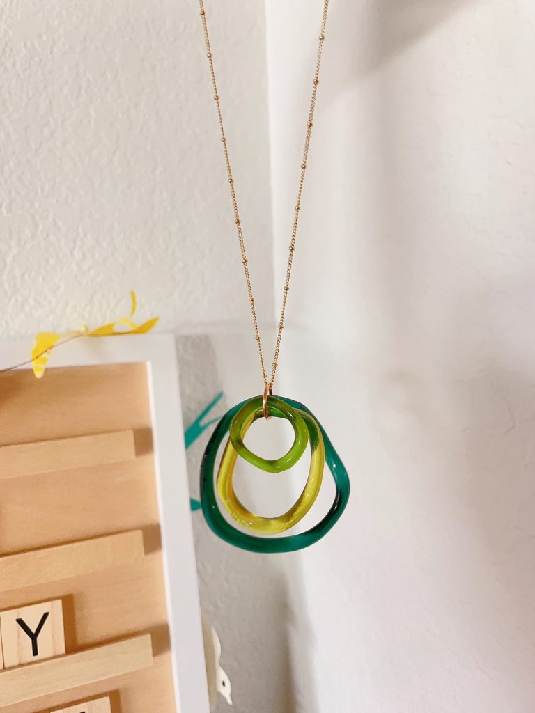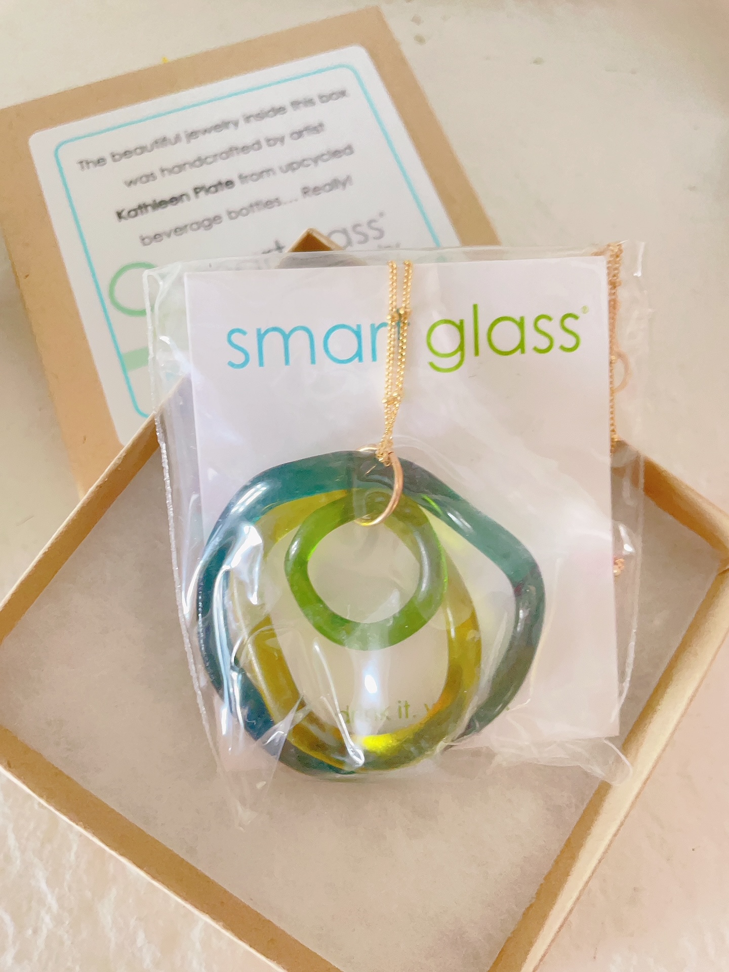 Part fashion, part art, Smart Glass large wave pendant is striking and unusual. The ruffled glass has movement and texture. Largest piece of glass will be approximately 3 inches of glass cut from a recycled bottle, complemented by the two inner colors of your choice. 18 inch gold fill satellite chain. Patented.