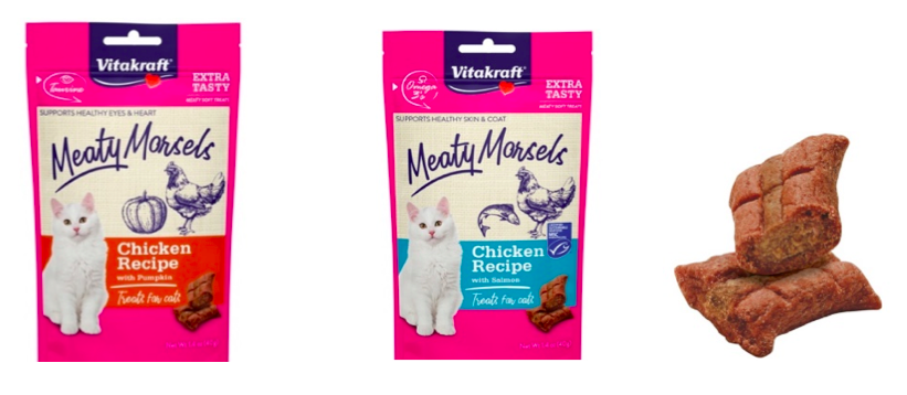 - Meaty Morsels, which are also available separately and can be found in both Chicken Recipe with Pumpkin and added Taurine to support healthy eyes and heart and Chicken Recipe with Salmon and added Omega-3 to support healthy skin and a healthy coat. Meaty Morsels refill bags are sold at an SRP of $2.99. A one-of-a-kind cat treat made from a high-protein chicken base formula, Meaty Morsels are moist and tender, bite-sized treats which are easy for cats of all ages to chew. They are made with over 70% real meat, with two layers of meaty goodness and a savory center, and are gently oven-roasted, making them great for disguising pills as well. The soft and delicious treats are made without artificial colors, making them safer for cats.